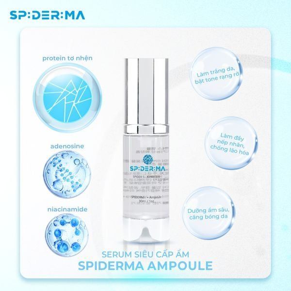 Serum siêu cấp ẩm Spiderma + Ampoule: Cấp ẩm chuyên sâu, giữ ẩm suốt cả ngày dài, giảm khô ráp, mang lại làn da mềm mịn. Dưỡng trắng, căng bóng da, cho làn da luôn tươi trẻ đầy sức sống. Chống lão hóa, cải thiện nếp nhăn, tăng cường sản sinh Collagen và Hyaluronic Acid.